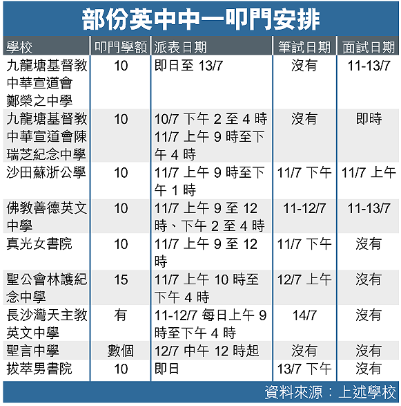 部份回覆本報查詢的英文中學,大部份將於放榜當日下午舉行入學筆試,考核中、英、數三科,其中真光女書院的數學科將採用英語。聖公會林護紀念中學麥副校長表示,為了可篩選成績突出的學生,叩門筆試的難度會略高於一般水平;長沙灣天主教英文中學的筆試,則以五、六年級課程設計。
