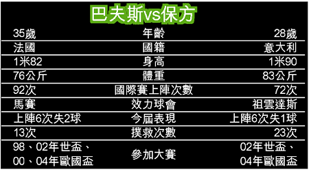 論到在國際賽資歷,法國門神巴夫斯可謂比較保方有過之而無不及,為法國國家隊已經上陣超過90次,而日前準決賽對葡萄牙之役,是他個人第16次替國家隊於世盃決賽周上陣,打破了保斯的舊紀錄。和98年奪標的那年一樣,巴夫斯把守的大門保持低失球率,同樣由分組賽打入決賽的6場賽事僅失2球。