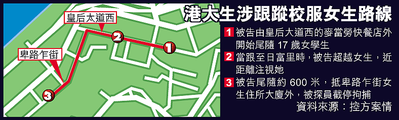 【本報訊】港大土木工程系一名三年級學生,在長沙灣街頭尾隨一名穿着校服的女生至家門,持𠝹刀威嚇,強行拖女生往梯間大肆非禮,又𠝹破她的內褲拍照,案件一直未被偵破,卻因港大生濕吻事主胸脯時,留有口水,數月後涉嫌尾隨另一名穿着校服的女生時被捕,警方核對DNA,拘捕涉案港大生,他昨在區域法院承認一項非禮罪名。