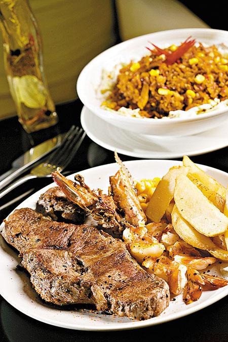 12安士新西蘭牛扒配一隻中虎蝦,份量十足;炒飯微辣,每一啖都很香口,兩款都是套餐,有前菜、餐飲和甜品。
