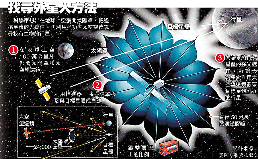 地球外是否真的有外星人?天文學家對遙遠星體上生命的探索,再有新進展。科學家構想發明一個太陽罩,形狀像一朵雛菊,計劃10年內將太陽罩發射上太空,就可遮擋來自遙遠星體的強光,再利用強功率太空望遠鏡,尋找有生物的行星,尋找外星人。