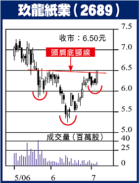 玖龍紙業(2689)昨收6.50元,升4.8%,股價於5月初以7.25元水平回落,6月中旬見底回升,上周升抵50日線轉橫行整固,一度突破該中期線位,但受制於保歷加通道頂未竟全功,昨天股價再度向上試關,保歷加通道頂開始往上擴展,9RSI轉強,成交支持升勢,股價料可破關而上,上試7.25元歷史高位,破位看7.80元,可在現價買入,以6.20元作止蝕位,上破6.65元可加1注。