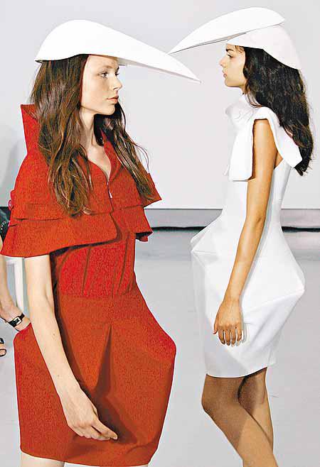 巴黎前天(周三)舉行的秋冬時裝表演,展出多名時裝設計師的作品,兩名模特兒穿上英國時裝設計師加利亞諾(JohnGalliano)的衣服後,活像兩個大公仔(圖一),而穿上由葡萄牙時裝設計師巴普蒂斯塔(FelipeOliveriraBaptista)設計的兩名模特兒,簡約的裙子配上鳥嘴般的帽子(圖二),平凡中見特色。 美聯社