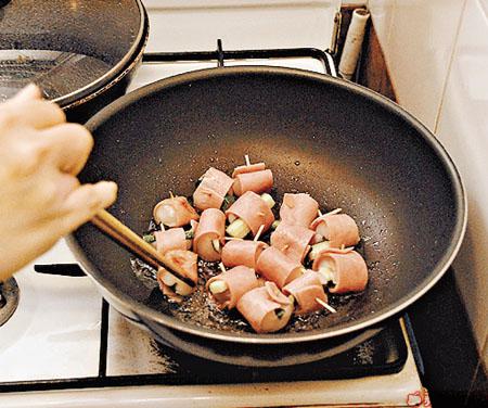 4.燒熱1茶匙油,將荔枝火腿卷煎熱即可上碟。
