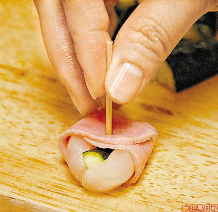 3.用火腿片捲起荔枝肉和青瓜條,再用牙籤串起。