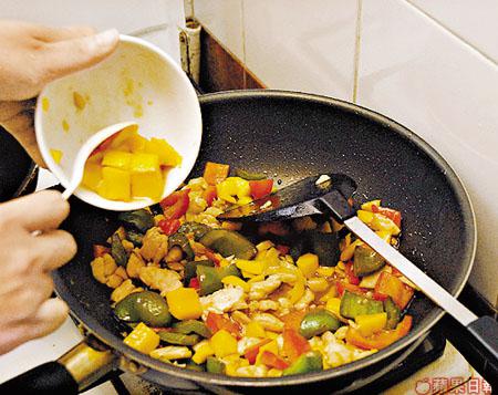 因芒果易熟,炒時最後才加入芒果,可避免把芒果炒爛。