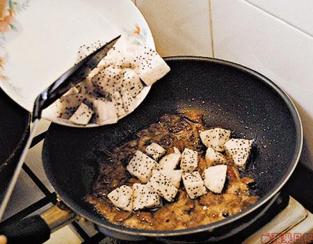 3.燒熱油,先炒熟牛肉,最後加入火龍果,少熱後即可。