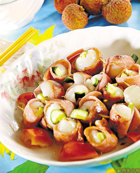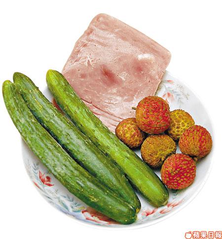 荔枝10粒、青瓜1條、火腿5片、油1茶匙