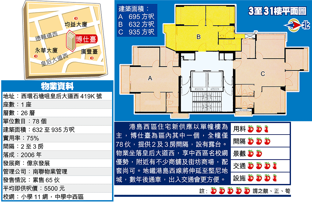 博仕臺樓高26層,僅提供78伙,每層3伙,A及B室屬兩戶,面積分別695及632方呎,C室3房連套房設計最受歡迎,935方呎,發展商指現時3房單位僅餘兩伙待售。物業已屆現樓,27樓設有示範單位供參觀。