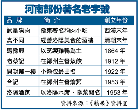 這批河南品牌歷史最長的是創立於西漢末年的「試量狗肉」,迄今已近2,000年,資歷最淺的為1955年創立的「洛陽酒家」。