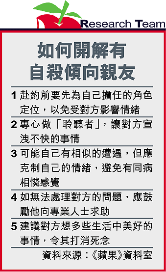 黃說,集體自殺事件原因可能是相約自殺,由於大家已有尋死念頭,較難改變他們的主意,這種情況較棘手。如果是大家互訴心事期間才萌死念,作為被邀請聆聽心事的一方,在傾談中注意一些要點(見表),應可以避免慘劇發生。