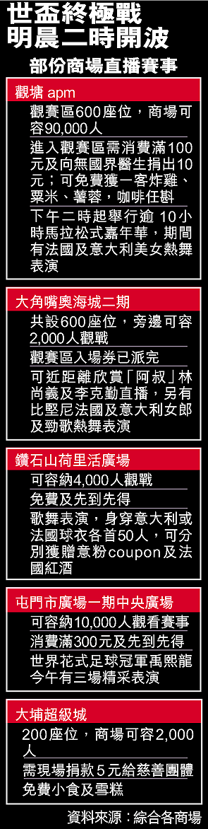 除傳統的酒吧及卡拉OK外,不少大型商場也加入今屆世界盃爭奪球迷戰,其中觀塘apm商場今日舉行馬拉松式嘉年華會,由下午2時起至明日凌晨2時球賽開始為止。其間會有法國及意大利民族舞、啦啦隊、意式擊鼓表演,更有意法美女全身繪上兩國國旗等,入場球迷會獲贈世盃禮品包一份。