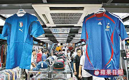 由於今晚決賽是法國球王施丹的告別戰,印有施丹大名的法國戰衣特別受歡迎。施丹燙字球衣每件$749,現時有錢也買不到。Bill指出,原裝燙有施丹及托迪的球衣已斷市,現時只有小量沒有燙字的法國及意大利隊作客版本球衣:「今次真係失晒預算,意大利同法國兩隊喺分組賽都打得唔好,冇諗過佢哋會入到決賽,尤其係施丹,好似上咗身咁。」