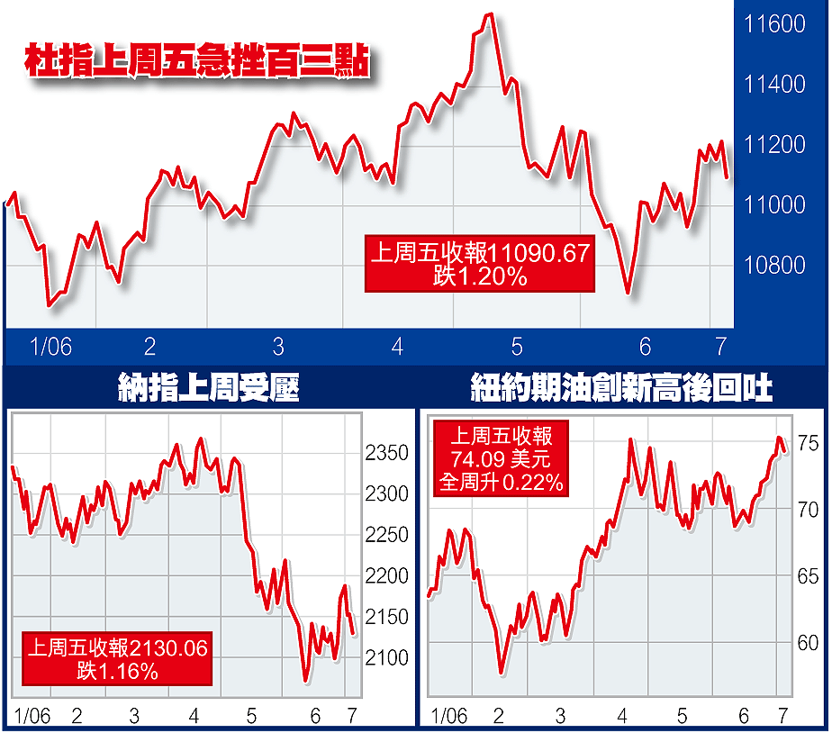 【本報綜合報道】杜指上周五下挫134.63(1.20%),收報11090.67,是6月5日至今最大單日跌幅;納斯達克綜合指數收市跌25.03(1.16%),報2130.06;標準普爾500指數跌8.60(0.67%),收報1265.48。總結全周表現,美股3大指數都低收。杜指跌59.55(0.53%);納指滑落42.03(1.94%),為上月9日那星期以來最大的單一周跌幅;標普指數跌4.72(0.37%)。