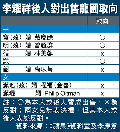 李康意昨向本報說,祖父生前育有五子兩女,但大宅只留給五名兒子,排名依次為李寶、李明、李康意生父李循、李謙及李韶,其中李寶及李明已離世。在今次出售祖業事件,李寶與李明後人扮演重要角色,率先贊成賣屋,而李循與李韶,及兩名沒投票權的女兒李潔琨與李潔瑤的後人均強烈反對。其中李韶年輕時跟妻子在龍圃定情,對大宅感情特別深,更提出自己出錢避免大宅出售。不過身在海外的李謙日前也同意出售,最終促成交易。