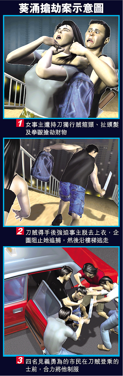 【本報訊】葵涌荔景山路昨凌晨發生駭人劫案,一名夜歸女子抄捷徑步行過百級樓梯回家途中遭獨行賊截劫,被扯頭髮、箍頸毆打及搶背囊,刀賊迫令女事主脫去上衣,以防尾隨追捕。女事主不甘損失高呼搶劫,驚動四名途人將圖乘的士逃走的疑犯拉落車。雙方發生激烈糾纏,最後疑犯被制服由趕至警員拘捕。混亂中其中兩名捉賊的好市民、遇劫女事主及疑犯均告受傷需送院。 記者:麥超億 伍浦鋒