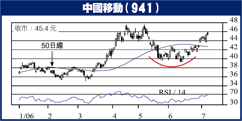 藍籌股之中,中移動(941)明顯跑贏大市,股價亦成大圓底,並正向全年高位47元水平進發。今次回升浪若然持續,其股價有望挑戰50元關口。筆者今年的愛股滙控(005)圖表上已出現了突破訊號;美元反彈浪完結,英鎊回升,將再度推高滙控股價,短期內有望上試142元全年高位。