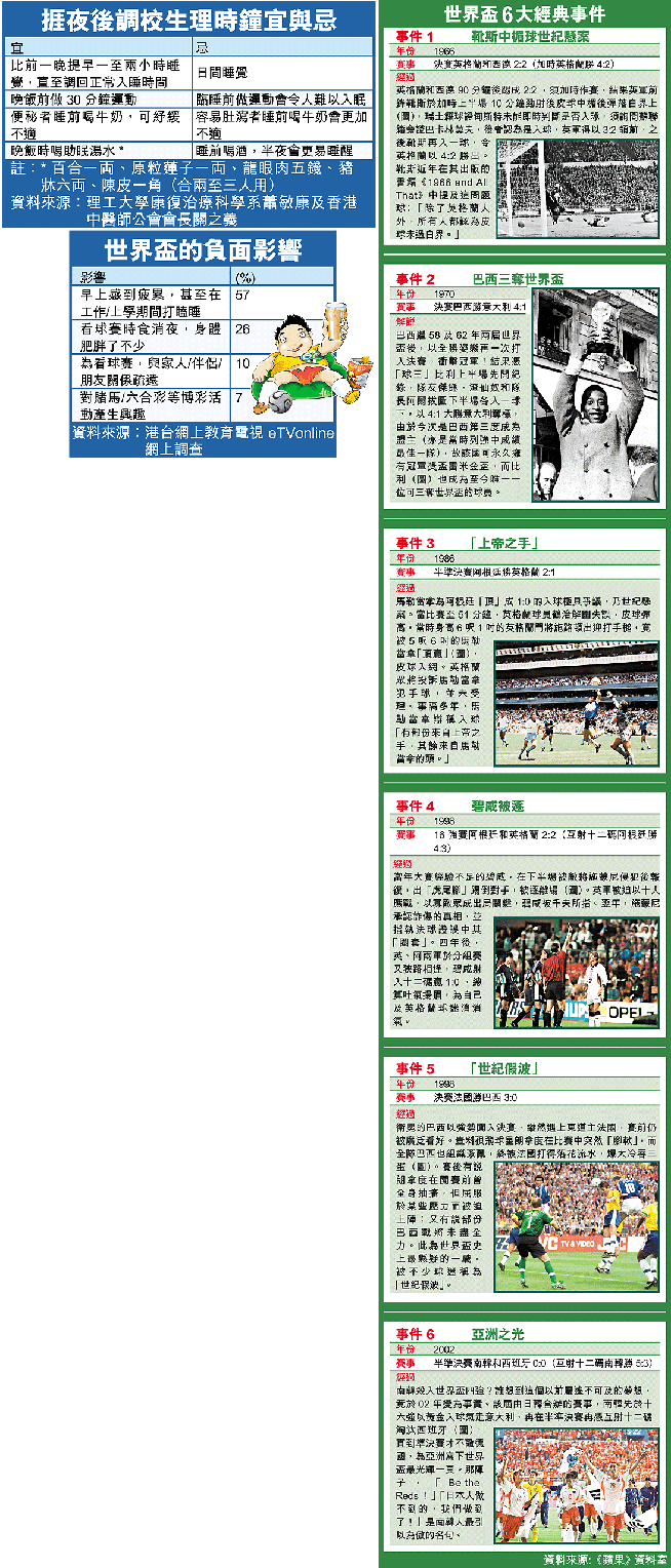 【本報訊】世界盃過後,是連串後遺症爆發的時候。一項調查發現,26%受訪者承認觀看球賽期間經常吃消夜,導致體重增加了;57%受訪者更在睇波後感到疲倦。有精神科醫生警告,經常捱夜睇波,有可能患上「睡眠周期顛倒症」,呼籲有記憶力衰退等症狀人士,盡快尋求治療。 記者:蔡建豪 白琳