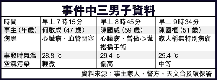 【本報訊】炎熱天氣下,本港昨日有三名中年男子疑抵不住熱浪暈倒,其中兩人不治,另一名患心臟病之的士司機開工駕車途中,疑舊病復發失事猛撼鐵欄,現時情況危殆;兩名死者包括患心臟病、事發時購買糯米雞給兒子作早餐的好爸爸,與預算今年內結婚的準新郎,噩耗傳來,家人悲痛不已。 記者:伍蒲鋒 簡明恩 梁偉權