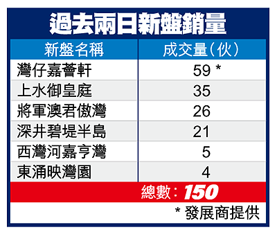 【本報訊】灣仔單幢新盤嘉薈軒銷情凌厲,加上再有貨尾盤重推市場,令過去周末一手成交暢旺,6個主要新盤兩天合共錄得150宗成交(見表),較前周114宗,上升31.6%。其中嘉薈軒兩天售出59伙,銷量稱冠,更佔成交總數近四成。挾現樓招徠的將軍澳君傲灣及深井碧堤半島,重推後首個周末日銷情理想,兩盤合共售出47伙。