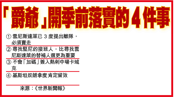 雲尼斯達萊勢被出售,只是「爵爺」在開季前落實的4件事之1(見附表),他特別提到加強中場實力的迫切性,據悉他將動用球會2,500萬鎊(約3億6100萬港元)引入中場猛將。「己隊當前急務是重組中場。當你失去堅尼這類球員時,必須盡快找尋替補人選。」