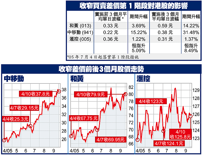 蘋果財經資訊研究組以3隻重磅股︰和黃(013)、中移動(941)及滙控(005)為例,評估措施推行前後3個月期間,其單日波幅有否因而有所增減。