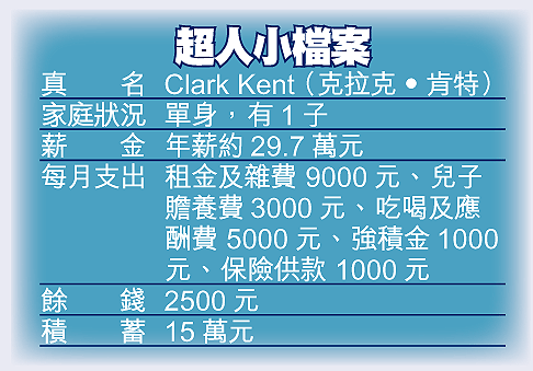 「超人」在《星球日報》當記者,月薪約2.2萬元,都算是單身的中產分子。四出行俠仗義的「超人」和普通人一樣,都希望有錢旁身,現在還要供養兒子,他每月薪酬扣除租金、贍養費、強積金、交保險及飲飲食食社會聯誼等,每月剩下約2500元作為投資,再加上之前儲起的十多萬的積蓄。不過,他不用跟人迫車,所以年中都慳回不少車費。不過遲些香港的曾特首同財爺唐唐推行的銷售稅真的落實,支出便會增加,日後可動用作投資的錢又會少了。