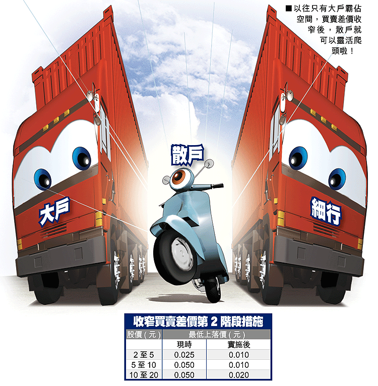港交所(388)今天起實施第二階段2至20元縮窄股份買賣差價。證券界普遍相信,未來一段時間因即日鮮交易頻率減少,令中小型經紀行經營壓力增加;也有估計,隨着市場反應因縮窄差價而加快、加大,部份投資者可能由銀行回流證券行,但最終對大市影響只屬中性,不過散戶投資者卻可以因為「爬頭交易」提供的彈性,戰術上勝機構大戶。