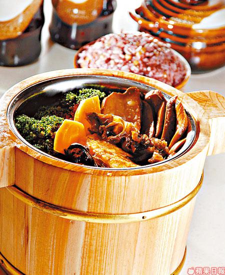 今屆食神爭霸戰入圍菜式,用紅米、麥米、糙米、香米及黑糯米煮成五穀飯,用木桶盛載保溫效果極佳。鴛鴦菇分別是茶樹菇及鮑魚菇,味道新鮮。