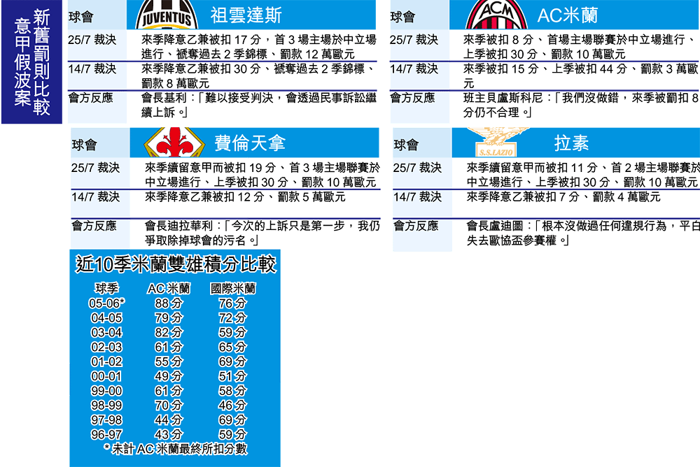意大利體育法庭周二為假波案上訴作出戲劇性的裁決,4支涉案球隊俱獲減刑(見罰則表),除拉素、費倫天拿可留級外,AC米蘭既可望參加來屆歐冠盃,而來季被扣分數由原先的15分大幅減至8分,俱屬新裁決的「大贏家」。球會副會長加里安尼放言在12月前可追回落後的8分上榜首,果然大口氣!