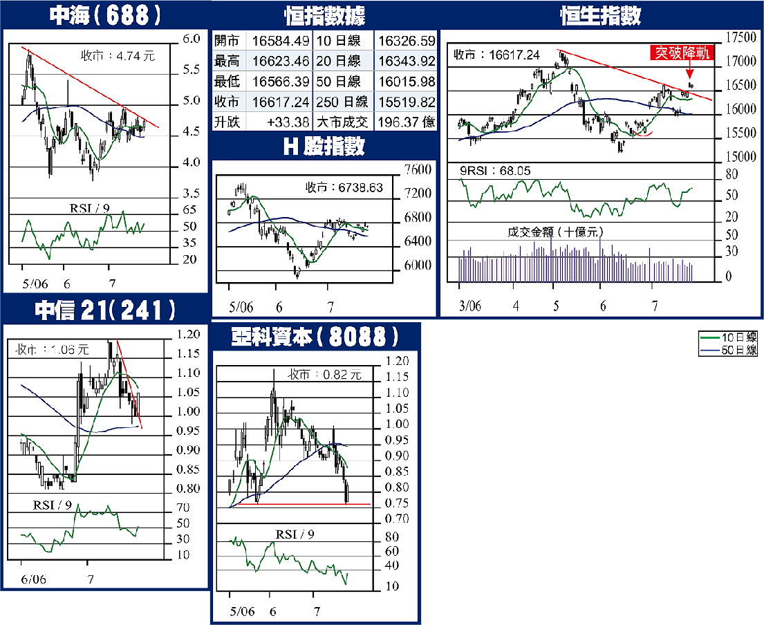 小時圖方面,恒指在10小時線(16512)及短線升軌見支持,只是幾個裂口上升之後,技術指標已呈現頂背馳,回吐的壓力不輕,短期內仍以鞏固為主調。
