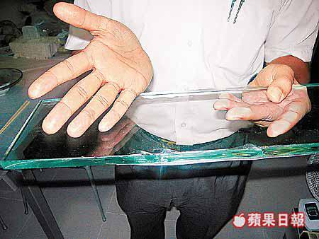 家具公司於5月初按時把三件家具送貨,當中包括一個用三塊玻璃組合成頂的茶几。上月中,吳先生用布清潔茶几玻璃面,玻璃組件突然左右搖晃,原本用膠水接合的三件玻璃組件分離,其中一件玻璃邊緣位置更出現鋒利切口,吳先生情急下手執其中一塊玻璃,右手無名指即時被割傷。吳先生處理傷口後,心感茶几只用了個多月,為何如此「化學」?他遂即時致電家具店投訴,職員解釋有關家具保養範疇並不包括玻璃部份,但吳先生堅持自己並無擺放過重型的物件,他質疑茶几設計欠妥,不但三塊玻璃未有妥善黏合,玻璃也未有採用強化玻璃:「今次我唔好彩割傷手,如果係一個小童被割傷,後果可大可小。」