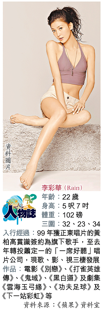 炎炎夏日,李彩華(Rain)覺得最佳的消暑方法是不停食雪條和西瓜,最高紀錄可獨自幹掉一個大西瓜,Rain又謂以前每逢暑假都會游水踩單車,不過現在這些活動對她已經十分遙遠了。