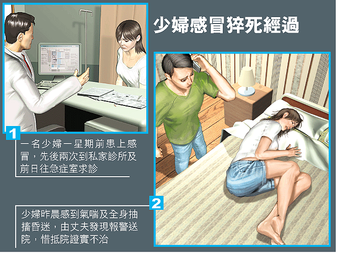 懷疑感冒猝死女事主姓黃(28歲),與姓區(36歲)丈夫同住屯門屯貴街18號一單位。據悉,事主一個星期前開始患上感冒,曾先後兩次向私家醫生求診,惟病情未見好轉。