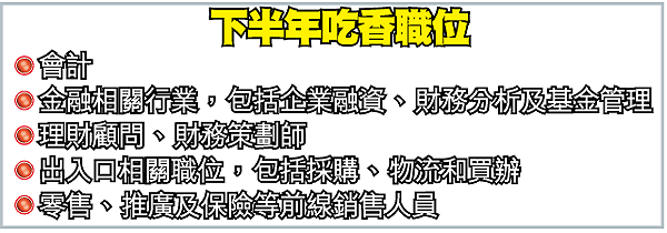 合眾人事顧問總經理蘇偉忠也指出,銀行、金融和會計人才十分吃香。「另一方面,出入口相關職位,例如採購、物流和買辦的人手很緊張,不少公司請不到人。」