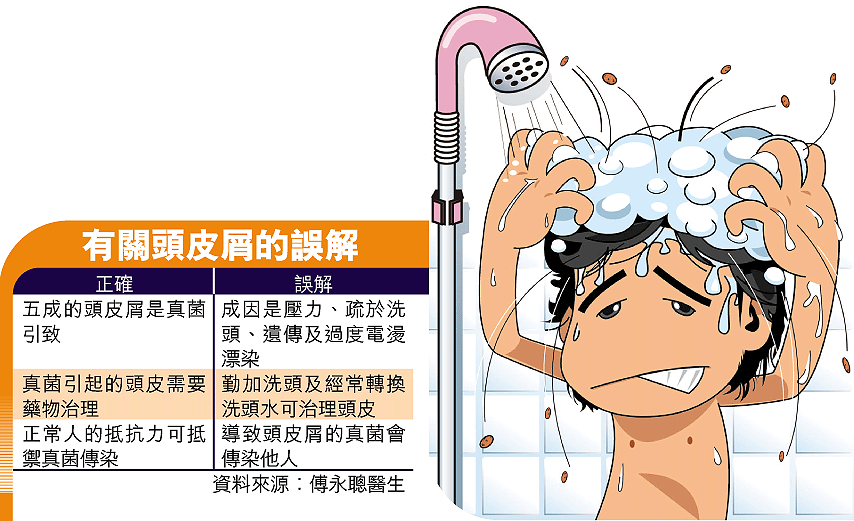 另外,家庭醫生傅永聰指出,真菌喜歡油脂的環境,故油脂分泌多的人是有頭皮屑問題的高危一族,當真菌繁殖過多,就會導致髮根周圍及毛囊受感染,出現紅腫、痕癢等情況,而新陳代謝也隨之加快,引起頭皮屑、頭痕,甚至皮膚炎等問題,他亦指出以正常人的抵抗力,真菌並不會通過日常接觸傳染。