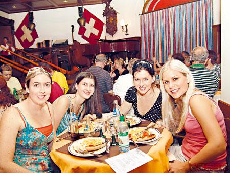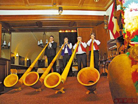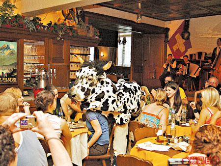 一行六人的瑞士民歌團在Stadtkeller餐廳已表演了十多年,堅持一年363天(聖誕及新年可能休息),每天表演兩場。午餐時分,一邊看他們表演,一邊吃瑞士芝士火鍋、瑞士腸及瑞士雪糕,當然上台吹兩咀號角不少得,但名額只得五名,想玩就要趁早衝上台!吹不到號角,不用灰心,還可學唱飄零燕主題曲,但如跟不了那「喲呀喲呀啦咕咕,啦咕咕啊呢咕咕」的節拍,大肚皮就要受受苦,請你喝罷1公升的大啤酒吧,當然,喝不下也有勇男相助!接着,大夥兒更會互蹺雙手,在座位上跟歌舞團唱的歌搖左搖右。最後,吃罷玩罷,最刺激就是牛牛出場,尤其一條長長的舌頭會狂用水潑打你塊面,一些人瘋狂逃避,一些人又不停揮手叫牛牛過去,想感受濕淋淋的感覺!其實這只是一隻人扮的假牛,濕的是普通水,不是牛口水!