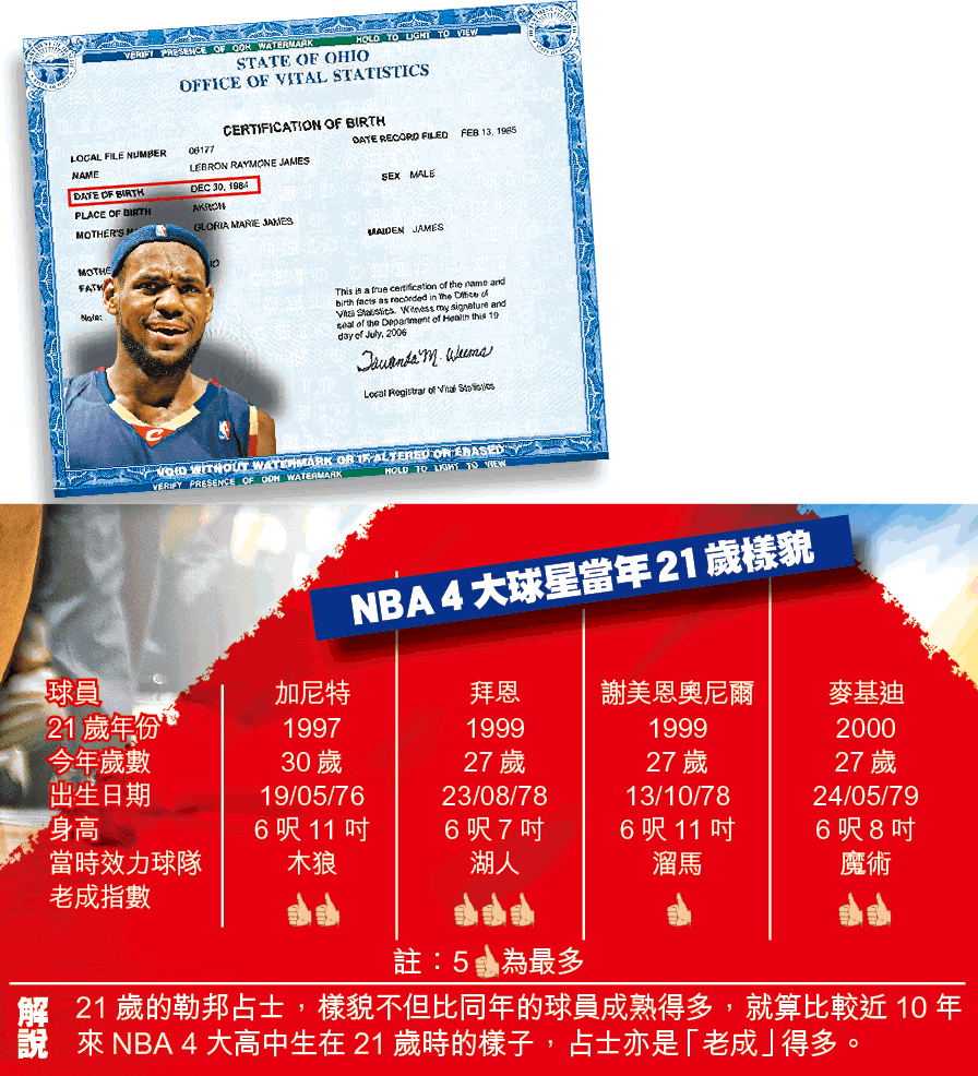 在「夢7」集訓期間,同是3年生的熱火控衞獲廸,非但沒有對坐在旁邊休息、雙膝及腳腕都敷上冰袋的占士予以同情,反而取笑他「活像30歲」,更笑言:「沒有人會認為他是21歲的,若果要我信,就拿出他的出世紙來證明吧!」幸好ESPN網站神通廣大,最近在俄亥俄州的市政府取得一份占士的出生證明書(CertificationOfBirth)副本,為占士進行了「大平反」,證明他確在84年尾出生,徹頭徹尾是一位21歲的年輕人。