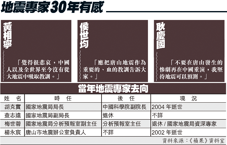 「唐山地震說甚麼也不應該漏報,那麼多人測出來了,只要和市民打個招呼,就不會死那麼多人,這絕對可以做到。」現已退休的侯世均,1976年時在河北紅衞中學地震測報小組從事地下物理現象反應來預測地震,並在當年6月預報出唐山地震。而當時的北京市地震隊專家耿慶國,亦從氣象上的變化預測出唐山地震,並於7月14日向國家地震局告急,各地區監測站亦紛紛呈報唐山地震預測。