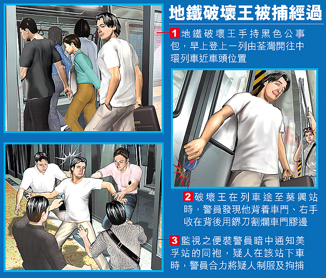 【本報訊】一名45歲的電訊技工,在過去14個月每朝乘地鐵上班期間,涉嫌至少75次以𠝹刀割爛車門的膠邊,警方及地鐵組成60人特別行動組,追蹤這名地鐵「破壞王」,結果昨日在美孚地鐵站將涉案男子拘捕,並在他身上撿獲一把小型𠝹刀。警方正調查破壞王為何特別憎恨地鐵,他目前仍被扣留調查。