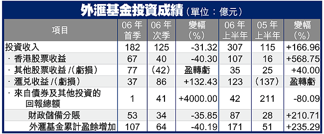 其實,外滙基金次季投資收入125億元,較首季的182億元少31%,收入減少正如任總所言主要是股票投資收入減少,其中港股減少40%;其他股票收入在第二季更錄得虧損42億元,首季則錄得77億元盈利。