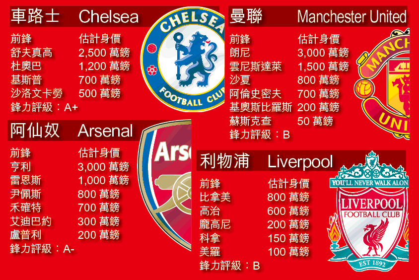 更何況,曼聯同市球會曼城亦坐擁6名前鋒,希臘國腳森馬拉斯、速度快絕的華素爾、新加盟的前意大利國腳哥拉廸及老將高爾等,每名前鋒均獨當一面,鋒力應僅比曼聯差些少。