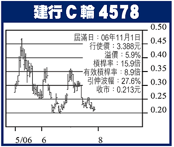 ■建行C輪4578收0.213元,升0.004元,成交143球。此輪06年11月1日期滿,溢價5.9%,槓桿率15.9倍,有效8.9倍,引伸波幅27.6%,街貨70.8%。此輪溢價較同期C輪3721與3862為低,正股見3.85元,其理論價達0.525元,升147%。