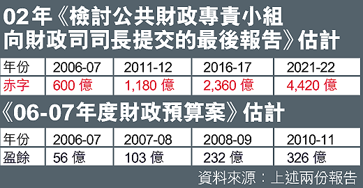 不過,民主黨經濟政策副發言人范國威昨踢爆該報告曾推算06/07年度會有600億元赤字、2021/22年度赤字更會高達4,420億元。但唐英年發表的06/07年度財政預算案,卻估計06/07年度會有56億元「綜合盈餘」,其後四個財政年度也有逾百億盈餘,2010/11年度盈餘會高達326億元。