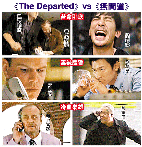 在導演馬田史高西斯(MartinScorsese)的鏡頭下,《TheDeparted》與港版《無間道》的味道及作風雖然截然不同,但由於兩片劇情大致相同,故預告片中有不少似曾相識的場面。