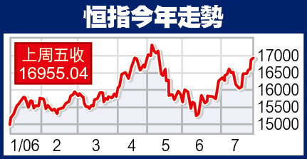 【本報訊】美國次季經濟增長數據較市場預期溫和,刺激美股上周五升119點,帶動中移動(941)及今日公布中期業績的滙豐控股(005)在美國預託證券造價顯著上揚,分別升上51元及141元,較香港上周五收市價升近2%及1%。市場估計,港股本周會跟隨外圍造好,加息陰影消退,地產股或接力上升,恒指有望上試5月高位17300點水平。