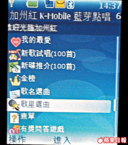呢項服務特別為S40及S60平台嘅藍芽手機而設,只要到任何一間加州紅安裝專用Java軟件,並輸入電腦所提供嘅藍芽配對碼,可即場於房間10米範圍內操作,內容包括100首新歌試唱、100首新碟推介、金榜、歌名及歌星選曲,甚至畀你覆查賬單等,想知每人夾番幾多錢,㩒個掣就睇晒啦!