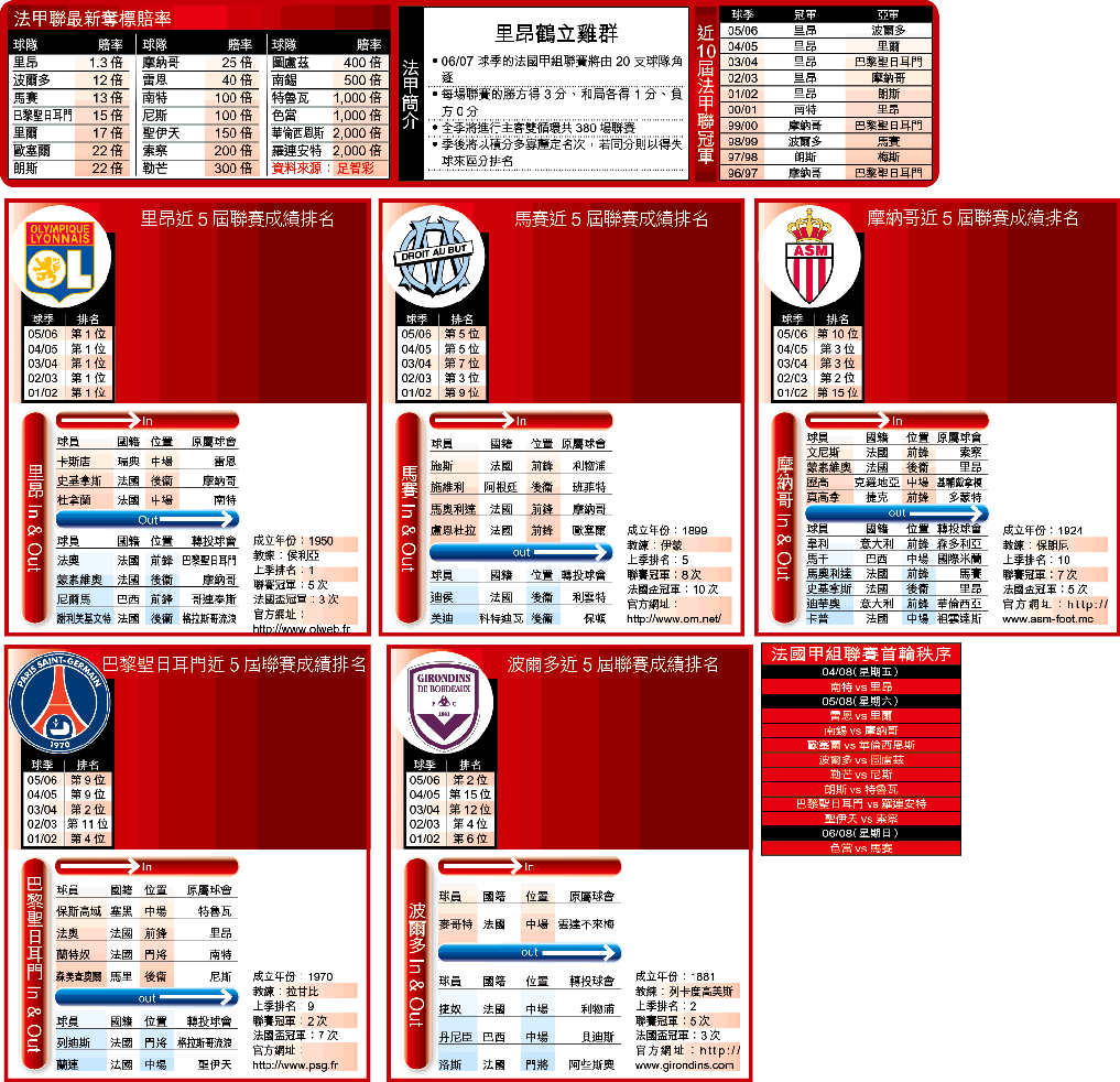 至於摩納哥、波爾多及里爾等黑馬分子,今季都各自存有隱憂,例如摩納哥更換主帥、波爾多季前增兵動作不大、里爾甚至有點散班感覺,相信都非來季法甲聯真命天子。