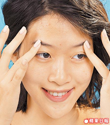 2.要擊退眼袋、眼紋及黑眼圈,早晚及上妝前必要塗眼霜,再配合按壓手勢。