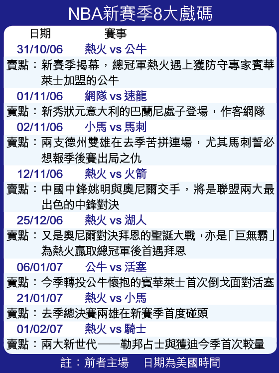 姚明效力的火箭將於11月1日展開新賽季,會作客猶他爵士。火箭最矚目的戲碼安排在11月12日上演,作客衞冕的熱火,這意味姚明與奧尼爾兩大中鋒今季首度交手,及兩大得分後衞麥基廸與獲廸對決。